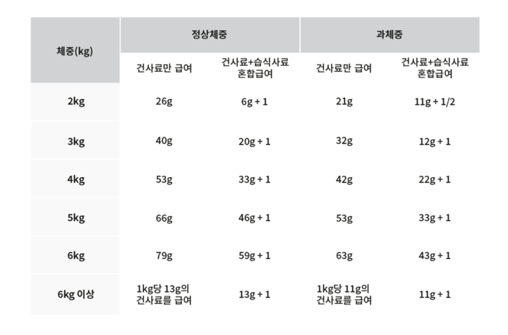 *활동량이 많은 고양이는 권장량보다 급여량을 늘려주셔야 합니다.