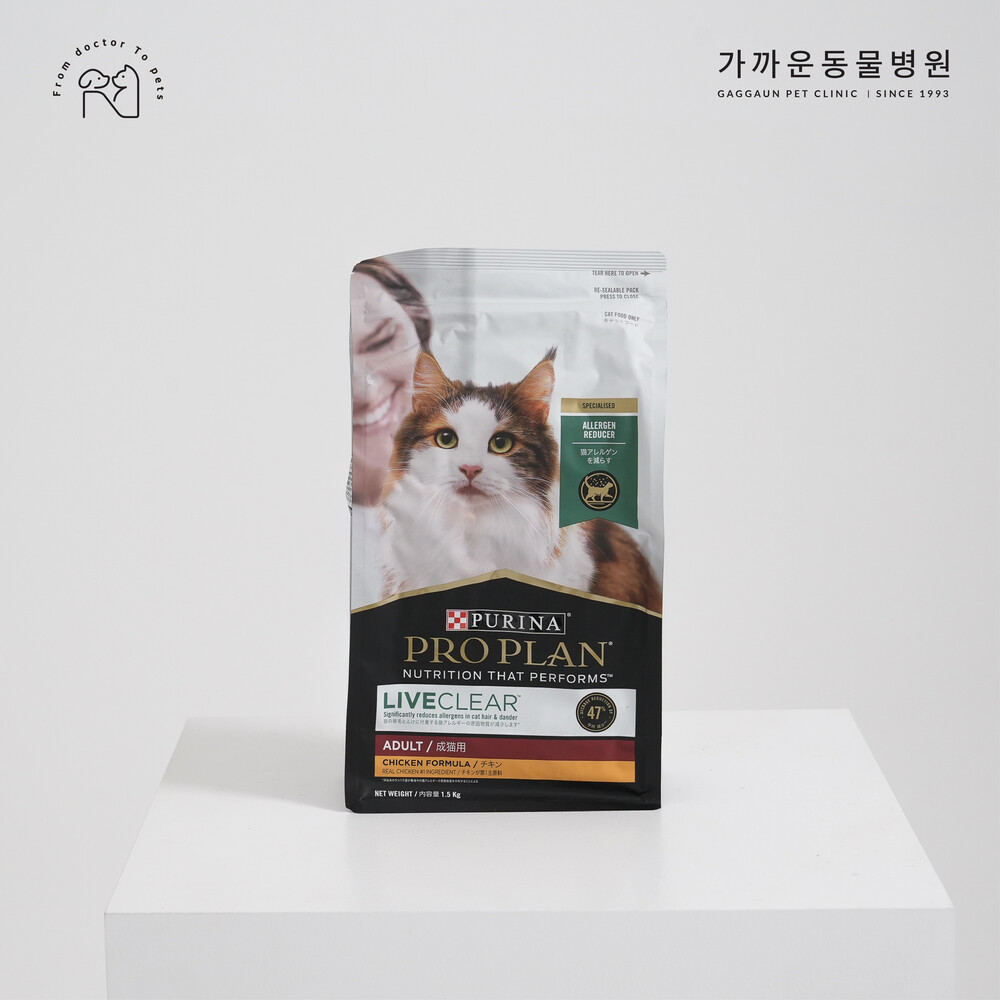 프로플랜 리브클리어는 고양이 털과 각질에서의 알레르기 유발 물질의 평균 47% 낮추어주는 혁신적인 식단을 제공합니다.